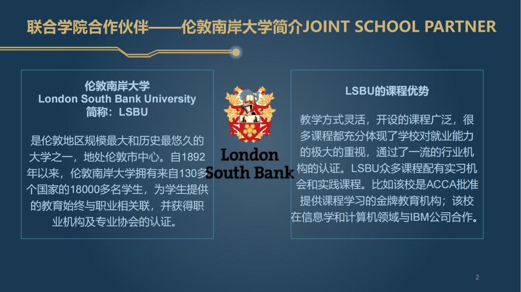 伦敦南岸大学 (London South Bank University,简称:LSBU) 是伦敦地区规模最大和历史最悠久的大学之一,地处伦敦市中心。自1892年以来,伦敦南岸大学拥有来自130多个国家的18000多名学生,为学生提供的教育始终与职业相关联,并获得职业机构及专业协会的认证。