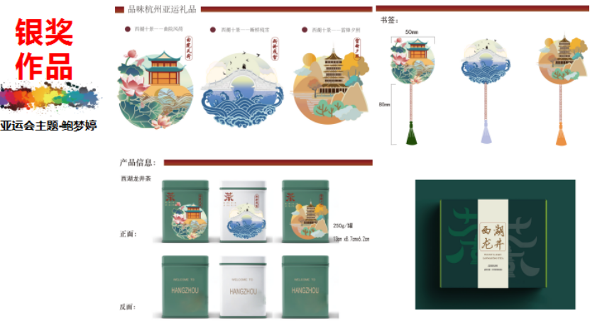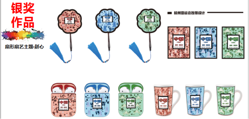 自该大赛举行以来,创意设计学院就将大赛的主题项目融入到相关课程的项目中,通过大赛主题的项目化,融入课程思政,在扇形、扇艺、伴手礼等主题上以亚运的人文精神及杭州的地域文化为创作方向,实现了课程项目作品到大赛产品的流程化,设计扇形扇艺、杭州亚运包装设计、书签、茶叶包装、交通卡等,我校学子提交的作品创意新、设计大胆,呈现材料非常多,与亚运的主题非常的契合,最终获得了一金、三银、六铜的优异成绩,展示了我校学子人文与专业的综合素质。