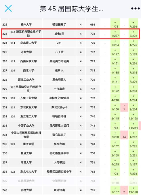 本次比赛吸引了清北、上交复旦、浙大杭电在内的几乎国内所有ACM竞赛强校,共计255所本专科院校、676支队伍,其中本科院校250所。经过5个小时的鏖战,我校“机电8队”(杨世纪、周伟剑、柳徐吉)发挥稳健、不负众望取得了高校第113名的好成绩。