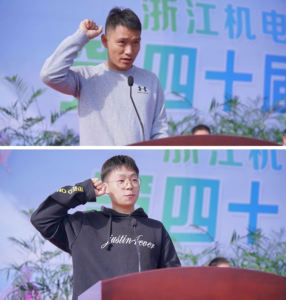 裁判员代表、体育部陈云飞老师,运动员代表、2020年浙江省大学生羽毛球锦标赛男子单打冠军、数控1821班李涛同学作赛前宣誓。