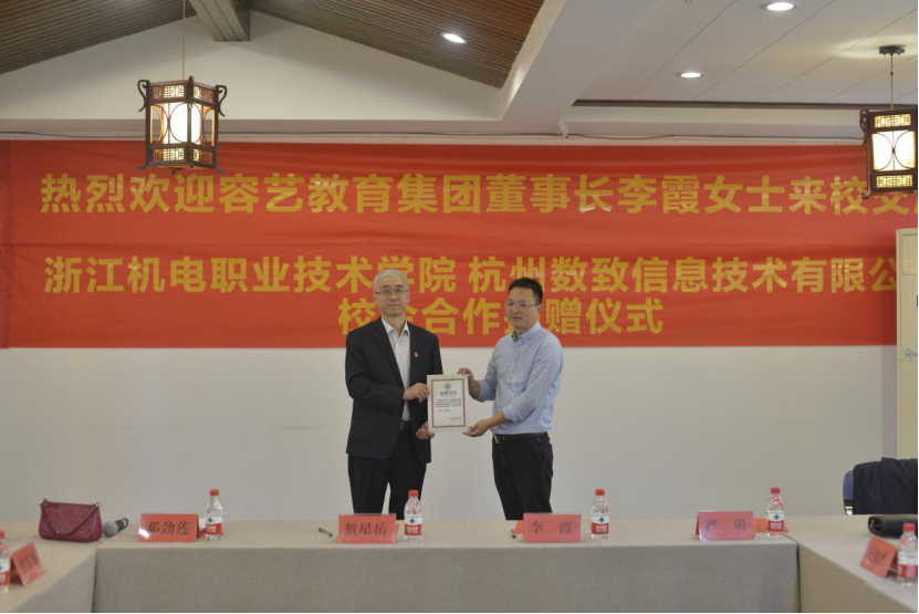 贺校长首先代表学校对李董事长、严总经理一行来我校交流指导致以热忱的欢迎,并将我校一直坚持“开放、合作、服务”的办学理念,以服务为宗旨、以就业为导向、走产学研结合道路,形成了三重融合、四方联动的办学模式向来宾们进行了介绍,并对杭州数致信息技术有限公司同我校开展深度的校企合作表示欢迎。贺校长代表学校与杭州数致信息技术有限公司严明总经理互相颁发了捐赠证书,并见证了校企合作协议的达成。