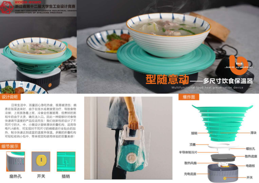 本次竞赛以“食”为竞赛主题,围绕饮食问题展开。在历时5个多月的时间中,我校师生积极备战,奋勇拼搏,最终,武凡老师指导的方可怡、王沁华、朱奇恩3名同学的《“食尚”——地摊烧烤车》,吴晓程老师指导的石文斌、王杰、刘方舟3名同学的《智能共享蒸汽便当盒》获得一等奖,许慧珍老师指导的沈童、张杰、顾家健3名同学的《“型随意动”多尺寸饮食保温器》,诸葛耀泉老师指导的赵亚峰、李嘉、李俊3名同学《“余温煲”》,诸葛耀泉老师指导的李小毛、王津、王慧3名同学的《"利热"-余热保温置物架》获得二等奖,尉锋老师指导的徐秉章 、宋超杰 、张晨旭 3名同学的《冷热皆宜饭菜宝》及其余4件作品获得三等奖。