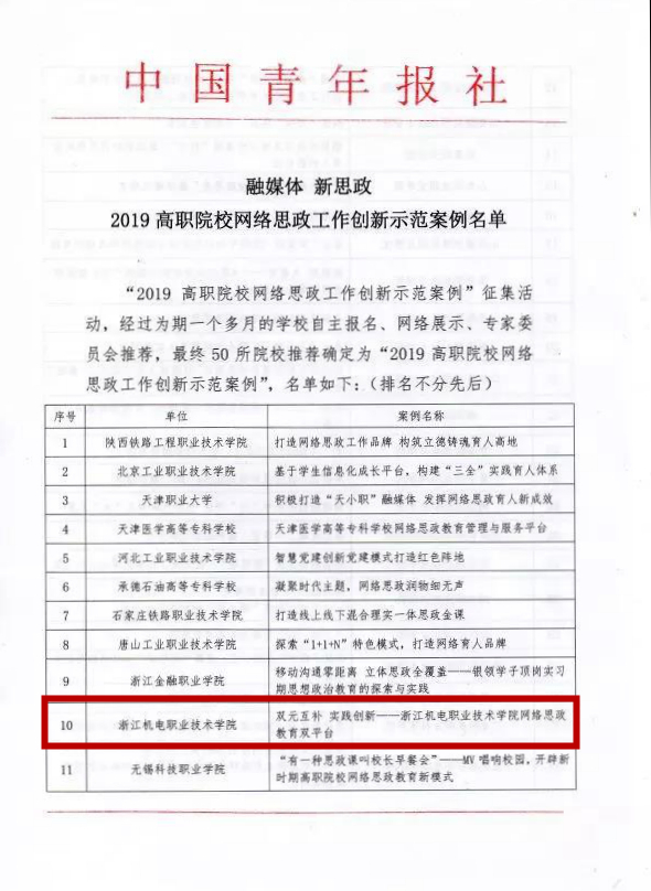 11月29日,由中国青年报举办的以“融媒体 新思政”为主题的2019年高职院校网络思政育人研讨会在陕西召开。我院提交的“双元互补 实践创新——浙江机电职业技术学院网络思政教育双平台”案例,通过中青报前期的网络展示、专家推荐,喜获2019年全国高职院校网络思政工作创新示范案例50强。