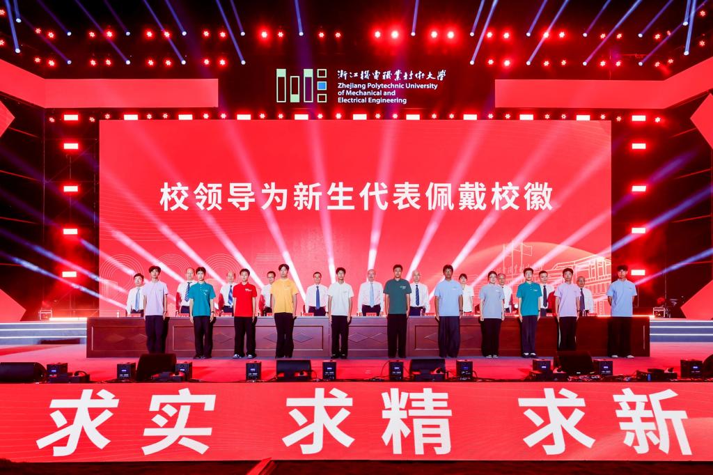 典礼上,校党委班子成员为新生代表佩戴校徽。这枚徽章,不仅代表着“机电人”的身份,更承载着机电大学“求实 求精 求新”的精神,承载着一代代机电人“勇立职教改革潮头,勇担服务发展使命”的荣光。