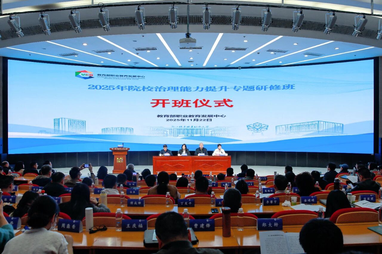 11月22日上午,在全国上下深入学习贯彻党的二十届四中全会精神的关键时期,2025年首期职业院校治理能力提升专题研修班开班仪式在浙江机电职业技术大学顺利举行。本次研修班由教育部职业教育发展中心主办、浙江机电职业技术大学承办。教育部职业教育发展中心副主任黄辉,浙江省教育厅职业教育与成人教育处处长、一级调研员陈达,浙江机电职业技术大学党委书记汤兆武出席仪式并讲话。全国各省市职业院校领导、骨干教师,承办校全体中层干部参加仪式。开班仪式由浙江机电职业技术大学党委委员、副校长孙丽园主持。