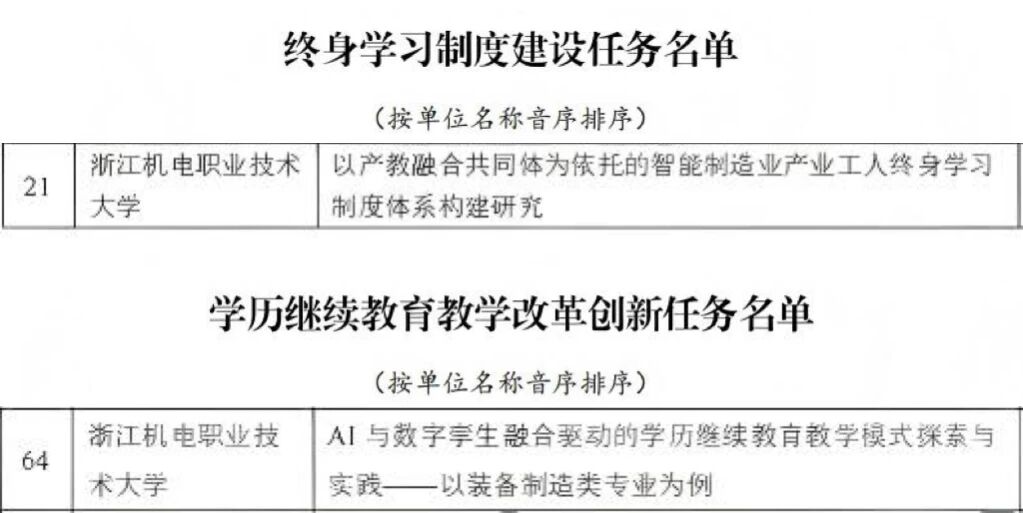 近日,教育部职业教育与成人教育司公布第三批高等继续教育领域学习型社会建设重点任务名单,浙江机电职业技术大学“以产教融合共同体为依托的智能制造业产业工人终身学习制度体系构建研究”项目入选终身学习制度建设任务名单,“AI与数字孪生融合驱动的学历继续教育教学模式探索与实践——以装备制造类专业为例”项目入选学历继续教育教学改革创新任务名单,首次在该申报任务中实现突破。