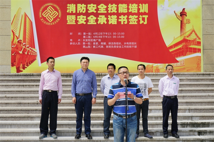 为进一步做好学院消防安全管理工作,提高抵御火灾的整体能力,有效防范火灾,保障校区发展和全体师生的安全,落实消防工作常态化,遏制火灾事故的发生,全力开展构筑消防安全“防火墙”工程。2017年4月19日下午,浙江机电职业技术学院长安校区组织了“消防安全技能培训暨安全承诺书签订”活动。院长助理倪志明老师进行了开训动员,并宣布活动开始。活动由长安综合办主任张荣路老师主持。参加此次活动的人员有学工部、学工处老师,各系辅导员老师,综合办教职工,各系各班负责安全工作的班干部,食堂、商铺的代表共计200余人参加。