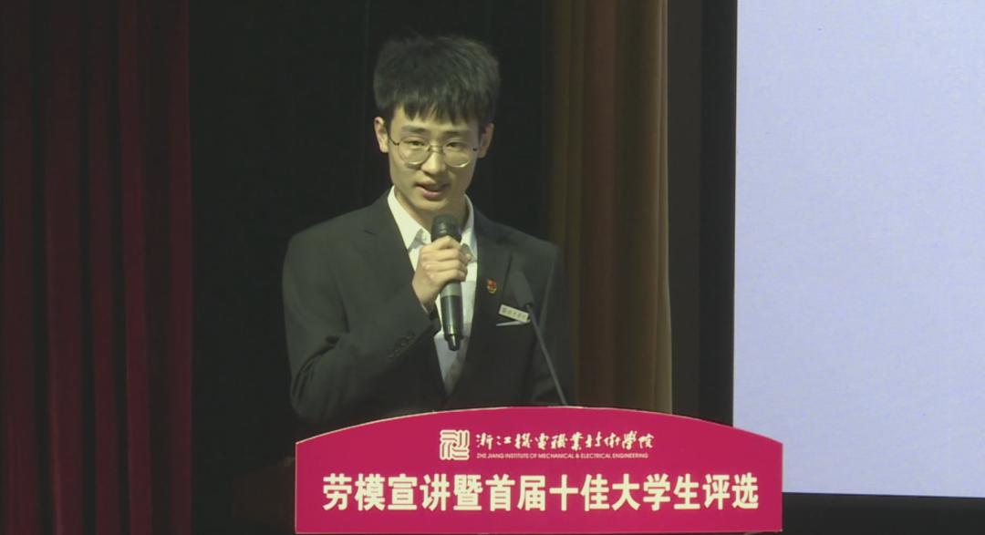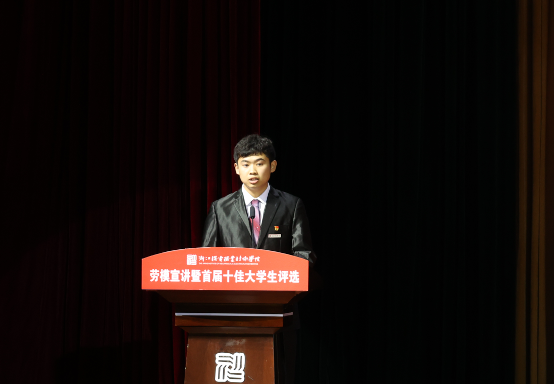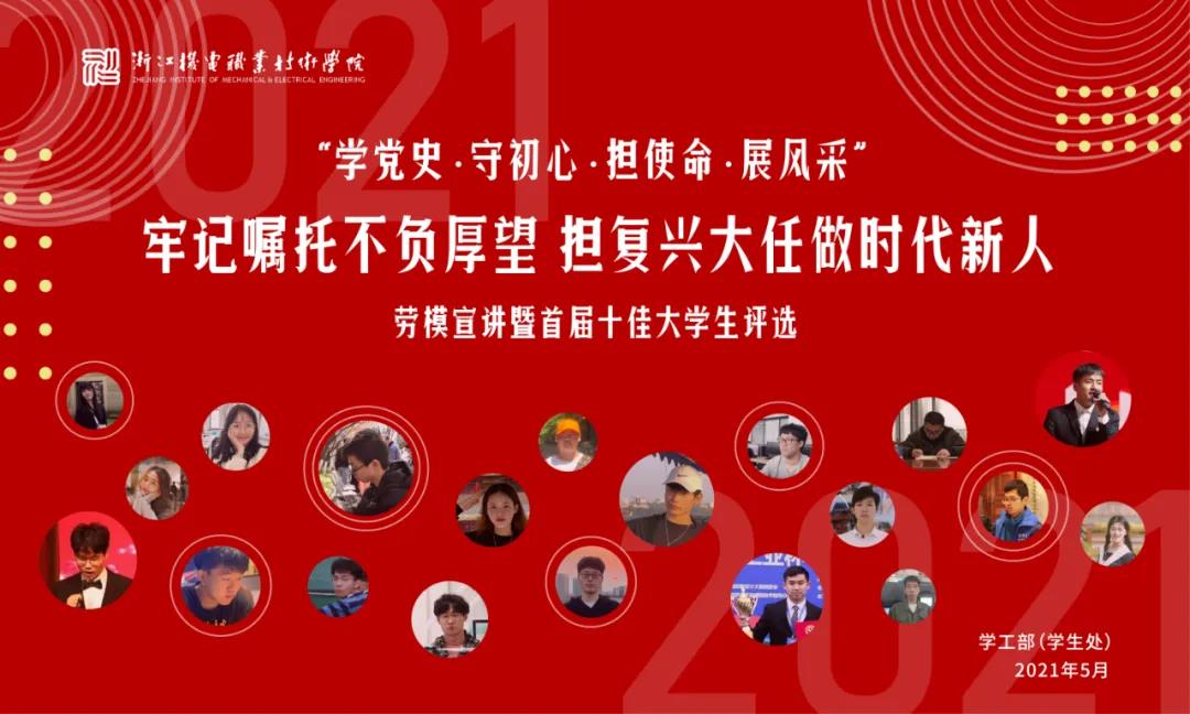 2021年5月18日晚,“学党史·守初心·担使命·展风采”劳模宣讲暨首届十佳大学生评选活动在滨江校区5号楼报告厅举行,校长贺星岳、党委副书记周增逵、学工部负责人、各二级学院党总支书记(副书记)、学工办主任、辅导员和学生代表出席活动。此次评选由浙江工商大学、中国计量大学等本科院校学工部部长,浙江商业职业技术学院、浙江艺术职业学院等高职院校学工部部长以及校内学工部、团委、招生就业处、马克思主义学院等部门代表担任评委。2021年“五一劳动奖章”、“浙江省劳动模范”获得者2005届杰出校友代表杨炯应邀参加活动并进行事迹宣讲。活动全程线上直播,海宁校区近四千余名师生通过网络全程观看。