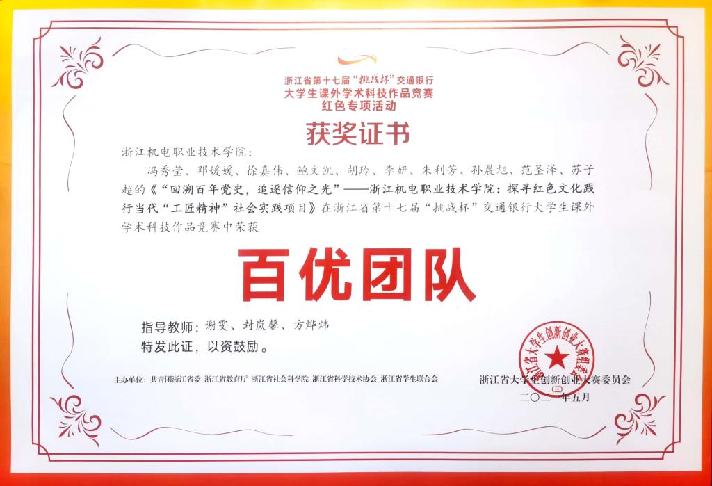 另外,在本届“挑战杯”竞赛红色专项活动中,我校组织329件作品共2635名学生参赛,其中作品《“回溯百年党史,追逐信仰之光”——浙江机电职业技术学院:探寻红色文化践行当代“工匠精神”社会实践项目》(参赛学生:冯秀莹、邓媛媛、徐嘉伟、鲍文凯、胡玲、李妍、朱利芳、孙晨旭、范圣泽、苏子超;指导老师:谢雯、封岚馨、方烨炜)获百优团队。