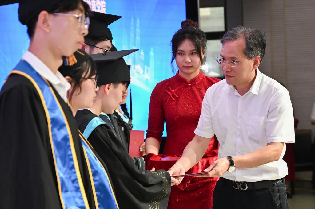 教研室主任陈竹韵老师、郁元正老师、张怡芳老师、林尔老师分别宣读了中澳合作国际贸易实务专业、中澳合作机电一体化专业、中美合作物联网专业以及来华留学毕业生名单,贺星岳校长为全体毕业生颁发了毕业证书。