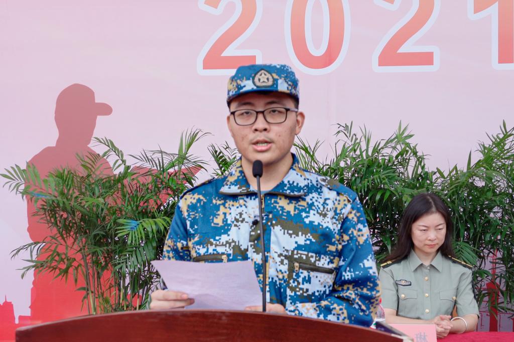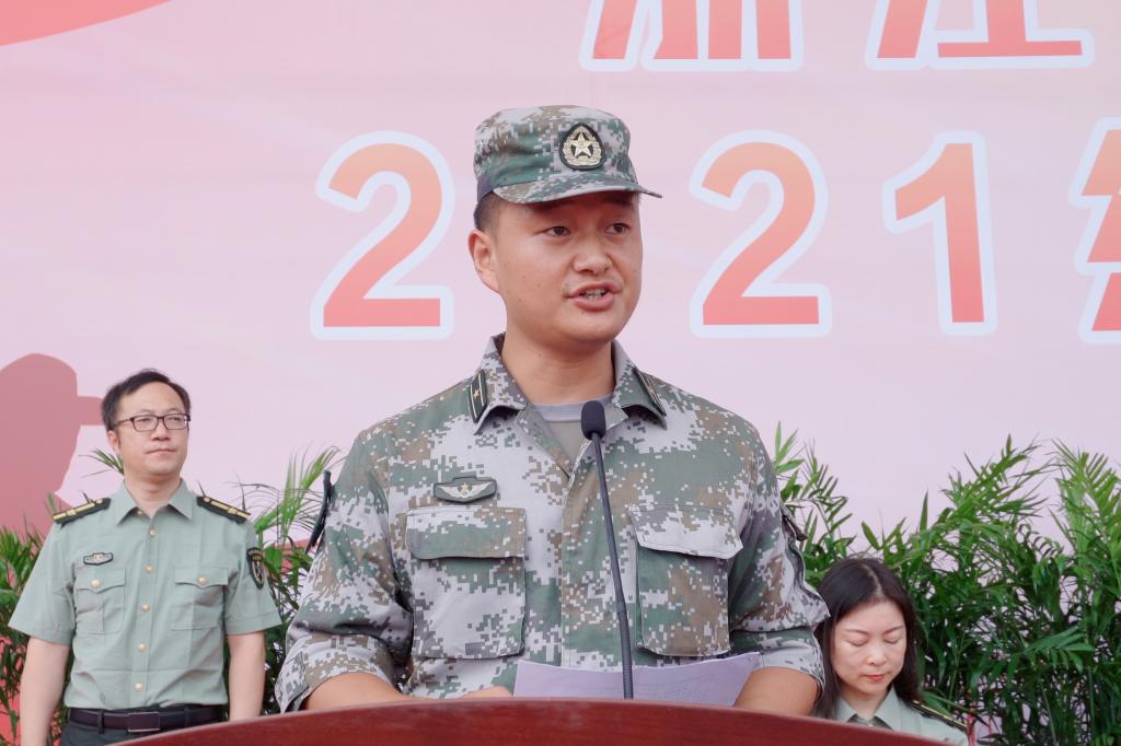 新生代表自动化2192班吴逸锴同学郑重表态,要以饱满的热情投入军训,尊重教官,服从领导,以军人的规范武装自己,展现学校优良校风,以实际行动展示大学生涯第一道辉煌。