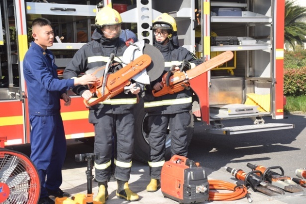 活动现场,演练人员详细指导,学生积极参与,了解如何进行心肺复苏。消防队员们将消防车的每个侧门打开,将车里的秘密一一呈现在同学们面前:灭火器、喷水枪、切割机、空气呼吸器、铲子等消防器材应有尽有,摆放有序。消防队员对这些器材分别进行了介绍,同学们兴奋地围着消防员队员,不断地询问各器材的使用方法。