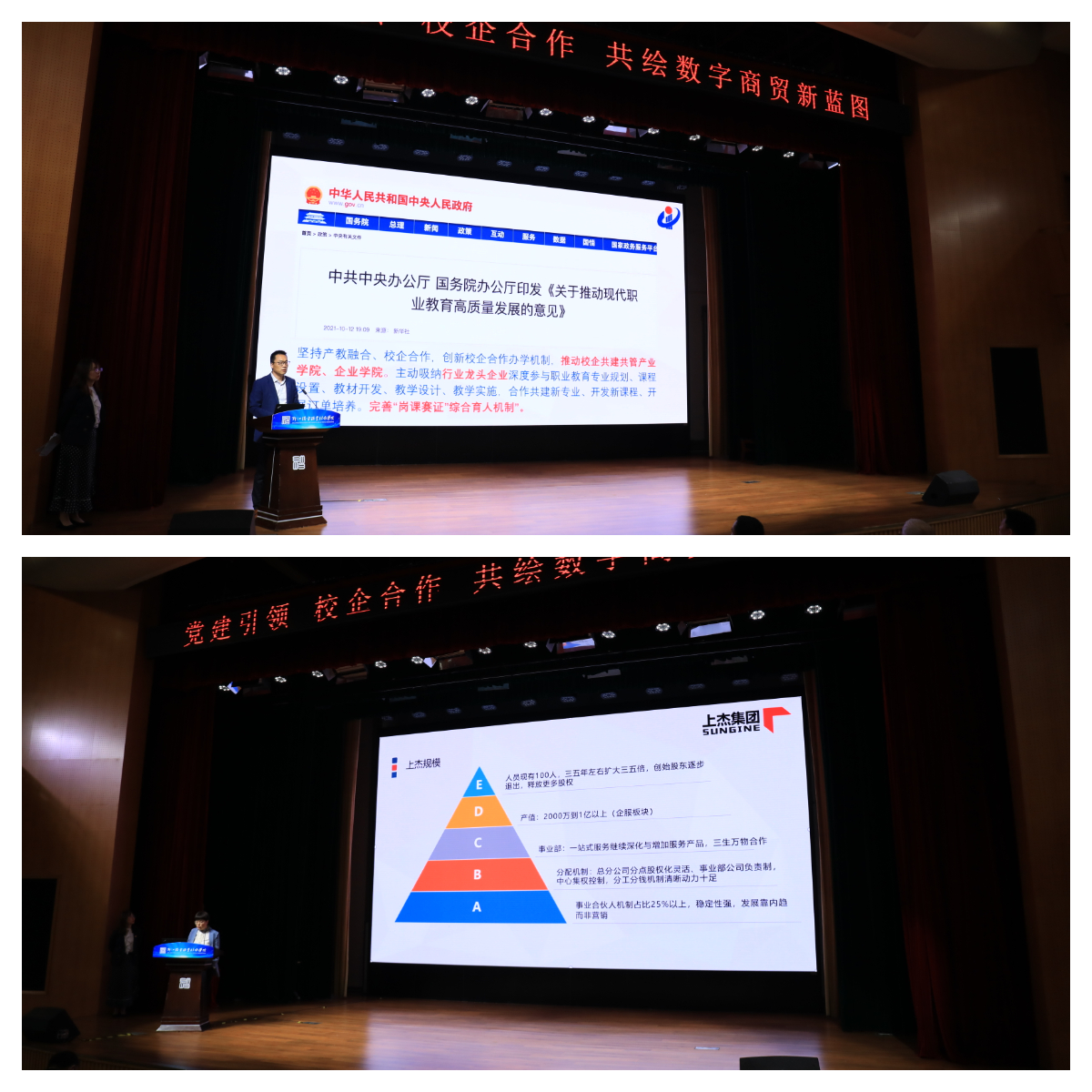 浙江机电职业技术学院校长贺星岳、《党建好故事》创作编辑研究中心主任总编辑蒋鑫富、阿里巴巴全球速卖通政府事务总监蔡晓辉中联集团教育科技有限公司副总裁冯学平、海盟控股集团有限公司集团轮值总裁倪华芬、杭州上杰控股集团董事长陈国琴、杭州紫驰网络科技有限公司总经理汤琳宏、浙江乌镇街科技有限公司董事长李立新、新道科技股份有限公司浙江省总经理吕京波四维生态科技(杭州)有限公司总经理营销总监霍田宁、杭州辉桐科技有限公司总经理吴佳裔、杭州富凌科技有限公司董事长黄晓刚等20余位企业代表,以及数字商贸学院师生代表济济一堂,共同探讨校企合作新模式,描绘数字商贸新蓝图。合作论坛由数字商贸学院互联网营销师全国技术能手陈娟主持。