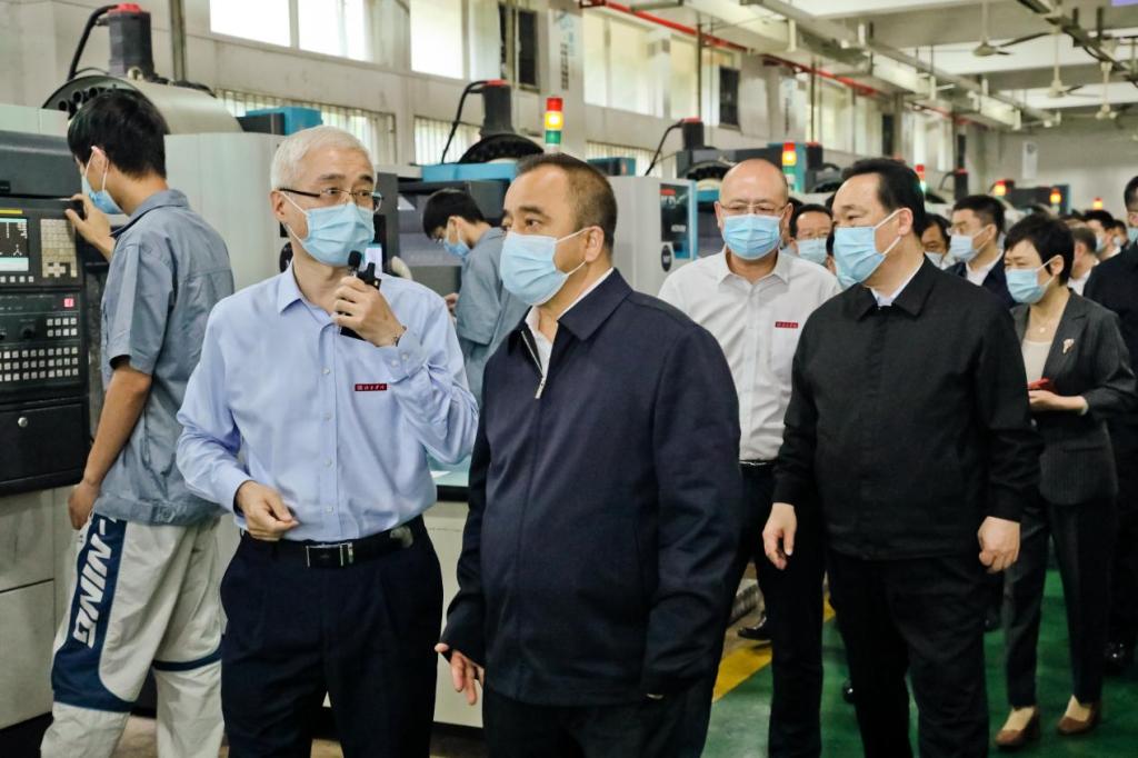 艾尔肯·吐尼亚孜、王浩一行来到数字化车间参观。数字化车间包括数控车削教学区和加工中心教学区,围绕学生技能训练进行布局,主要涉及数控车、数控铣的技能训练。这里既能培养制造业专业学生的基本职业素养,又能开展社会培训。艾尔肯·吐尼亚孜一面称赞,一面详细询问学校相关经费投入和人才培养等情况。