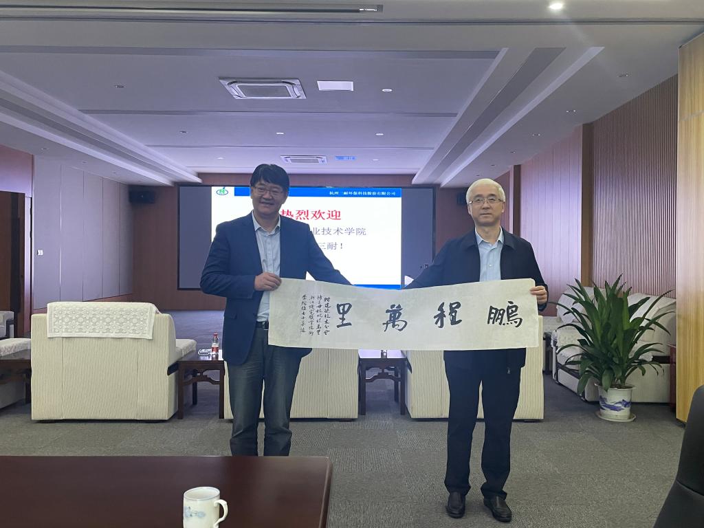 贺星岳对林建平的实干精神和家国情怀给予高度评价,对杭州三耐的创新能力和已经取得的成绩表示充分肯定。贺星岳详细介绍了母校在人才培养特色、专业建设、招生就业、教学科研等方面取得的成绩,他表示学校会持续加深与校友企业交流合作、科研成果转化、人才培养、人才输送等方面优势互补。贺星岳详细介绍了70周年校庆的筹备情况,希望广大校友常回家看看,忆往昔峥嵘岁月,感受母校日新月异的发展。贺星岳还为林建平颁发了“毕业生高质量就业校友服务站”,并赠送了母校老师亲笔提字“鹏程万里”。