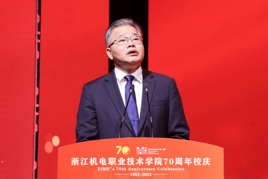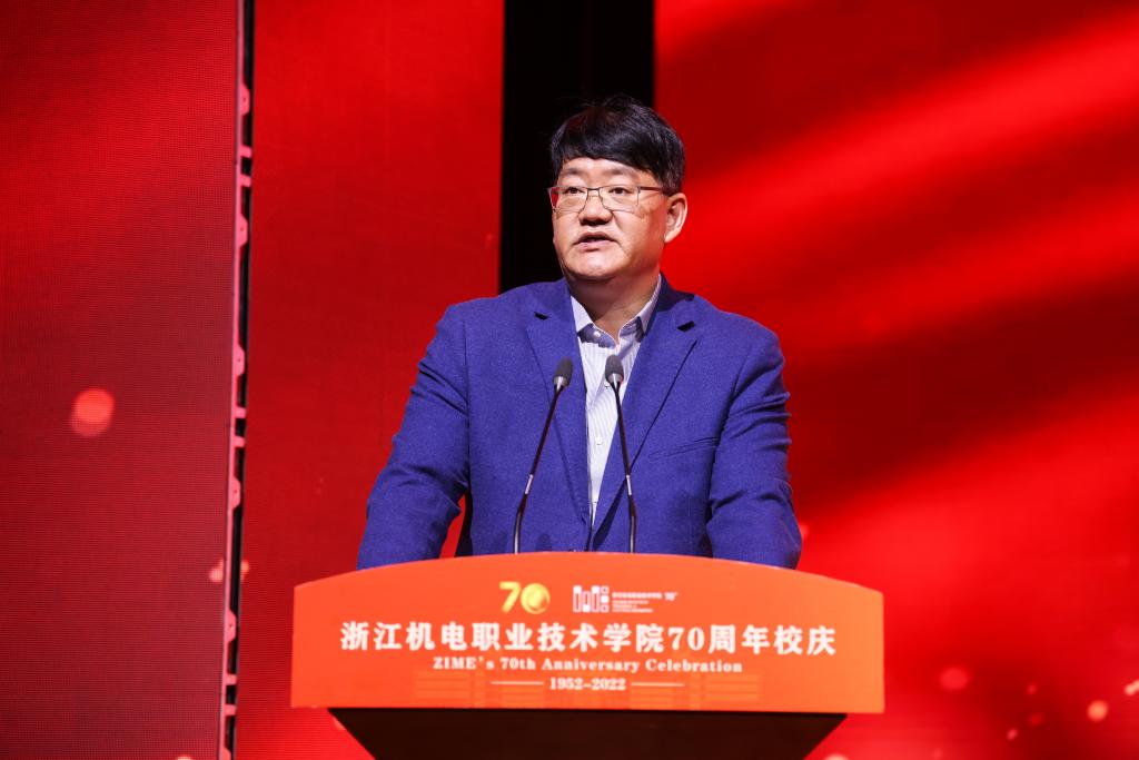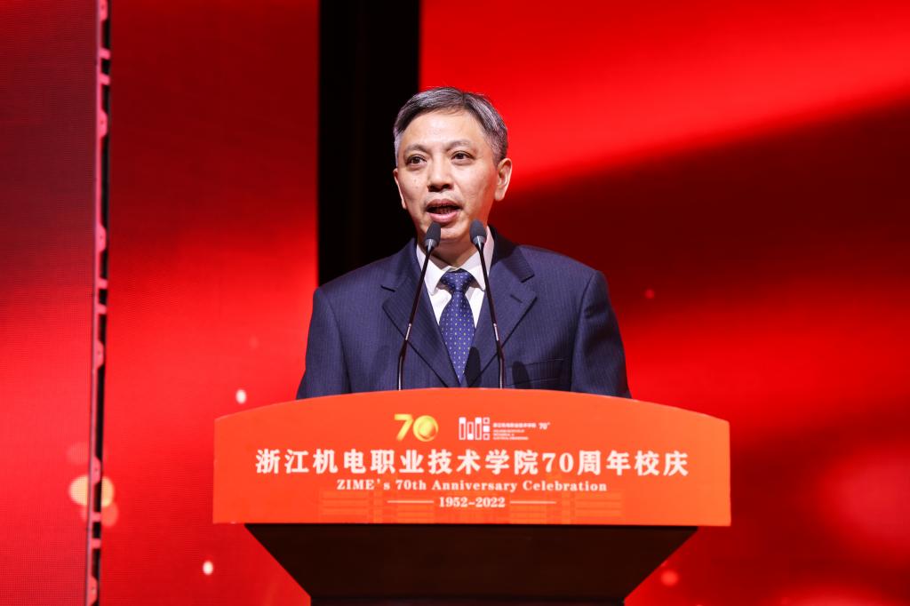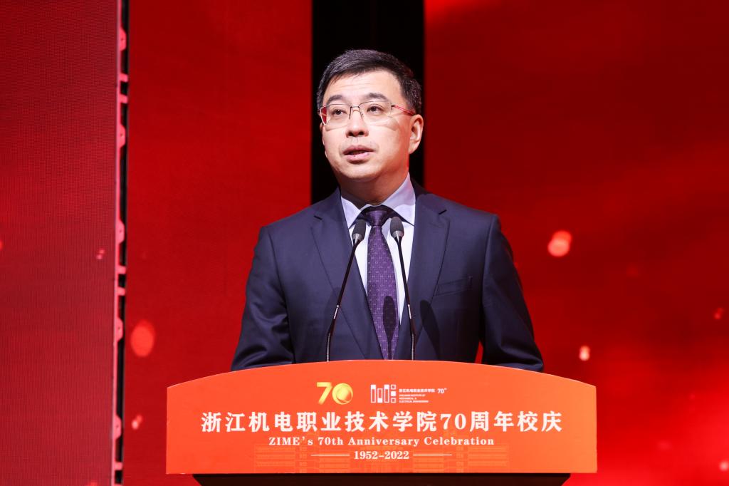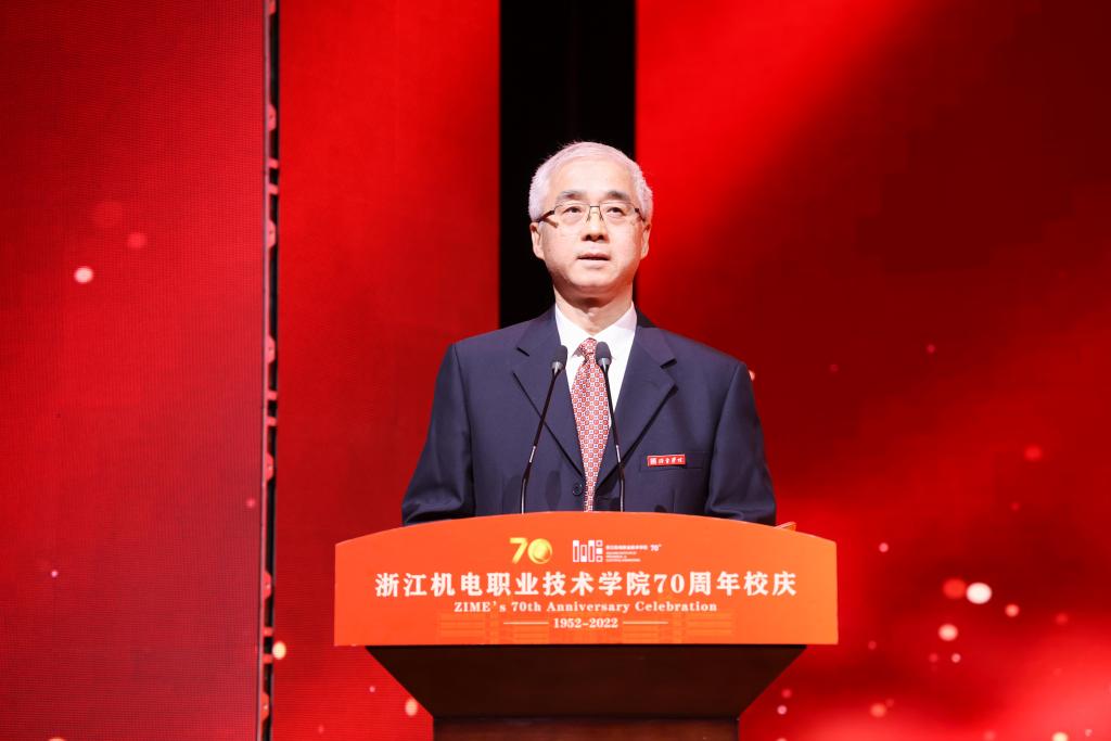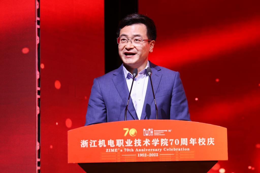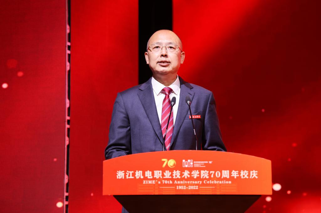 省机电集团董事、总经理杨震宇指出,70年来,浙江机电职业技术学院走过了一条极不平凡的发展之路,也取得了不寻常的发展成就,在服务浙江省经济发展尤其是浙江制造业发展中作出了十分积极的贡献。希望学校以70周年华诞为新起点,深入学习贯彻落实党的二十大精神和省十五次党代会精神,坚持立德树人根本任务,抢抓先机、乘势而上,努力前行、着力奋发,巩固自身优势,提升综合实力,打造人才培养高地和技术创新高地。省机电集团、职教集团将紧紧依托自身的产业资源,深化校企协同创新,产教深度融合,科教深度融汇,形成教育链、产业链、人才链、创新链的有机对接与融合,为学校未来发展创造更加优越的条件和更加有力的保障,为我省在高质量发展中奋力推进“两个先行”和中国式现代化作出更多更大的机电贡献。