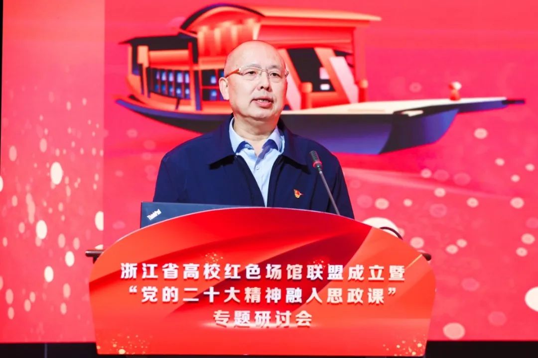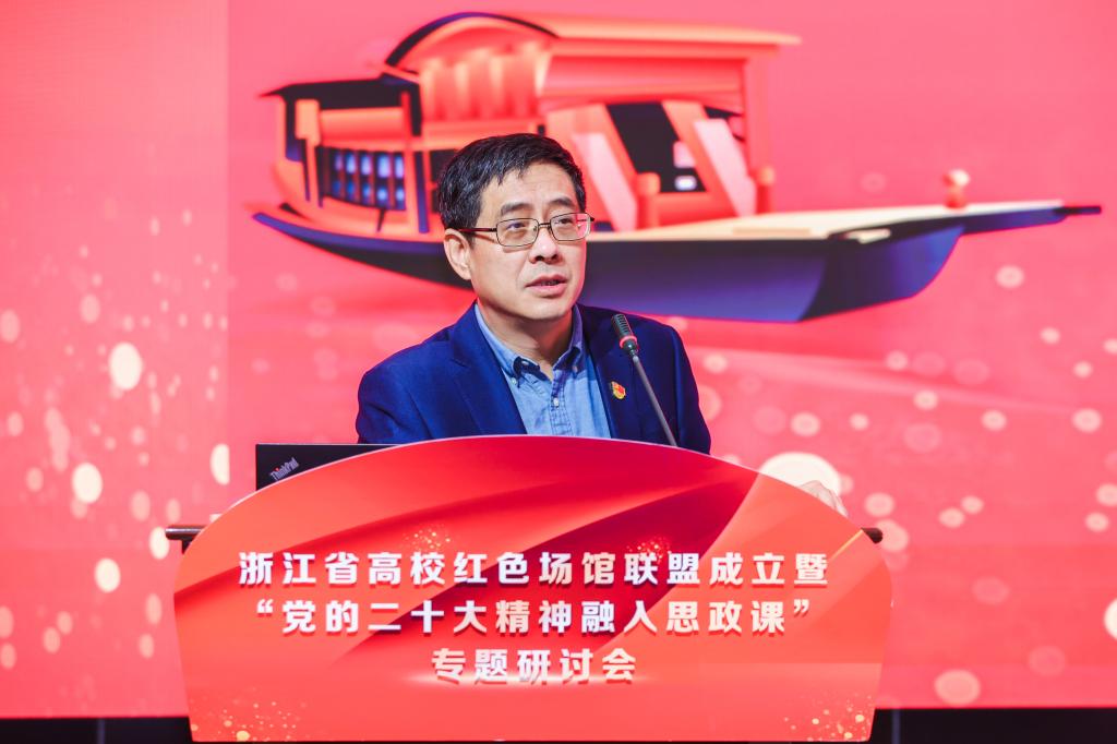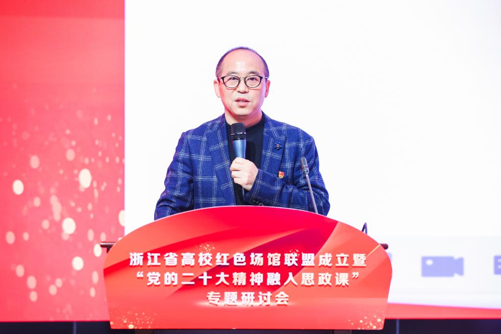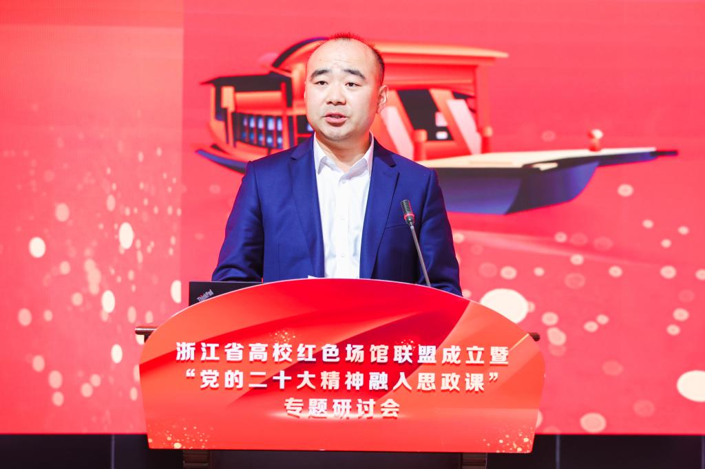 汤兆武代表学校对联盟的成立致以热烈的祝贺。他表示,浙江高校红色场馆联盟成立暨党的二十大精神融入思政课专题研讨会在学校召开,是联盟对学校的充分信任和鼎力支持,是对学校思想政治理论课改革建设,特别是对筑牢“红色根脉”主题教育实践基地建设的充分肯定。