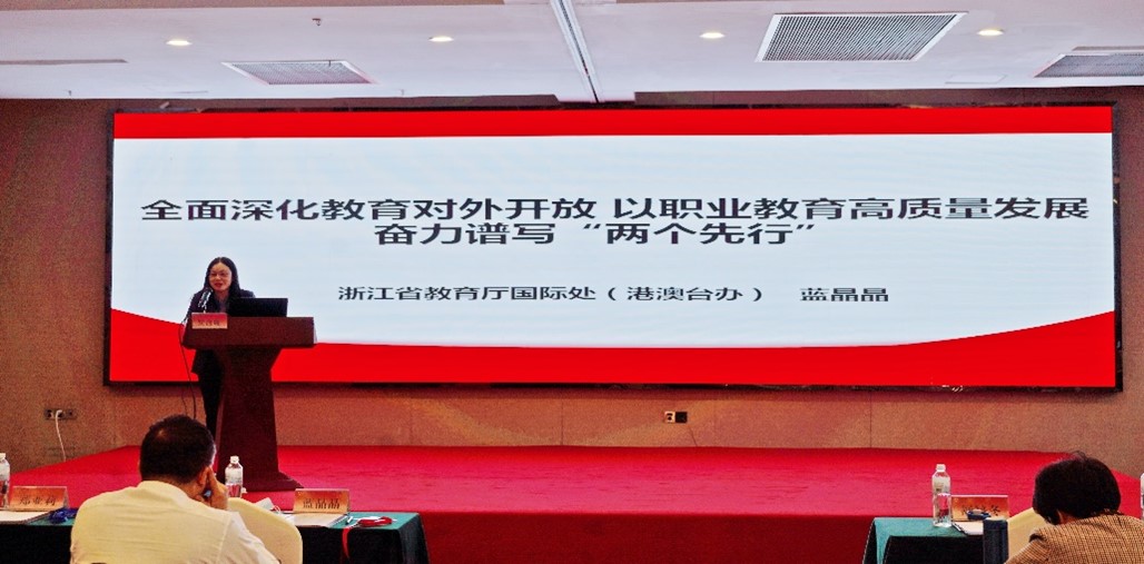 会议第二阶段由浙江省教育国际交流协会高职分会副会长、浙江工商职业技术学院副院长应晓清主持。中国教育国际交流协会职业教育与培训部主任何培、浙江省教育厅国际合作与交流处处长蓝晶晶分别作了题为“新征程、新时代——职教对外开放加速前进”“全面深化教育对外开放,以职业教育高质量发展奋力谱写两个‘先行’”的专题讲座。两位专家的报告高屋建瓴,对我省高职教育国际化的具体实践提出了新要求、新方向。
