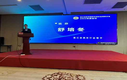 舒培冬在致辞中总结了浙江省高职院校在国际合作交流方面取得的成绩,充分肯定了高职分会在搭建平台方面起到的重要作用。他指出,高职分会成立以来,资源共享、优势互补、“抱团”行动,整体推进国际合作与交流,在提升我省职业教育国际影响力方面起到积极的作用,分会年会也成为全省高职院校交流经验、分享成果的重要舞台。由于疫情、国际关系等多重原因,职业教育国际化步伐有所放缓,大家在工作中也遇到了各种困难和挑战,他希望大家保持定力、深入探讨、凝聚共识、寻求方案,促进我省高职院校更好地服务“一带一路”倡议,努力开创我省职业教育国际化发展新格局。