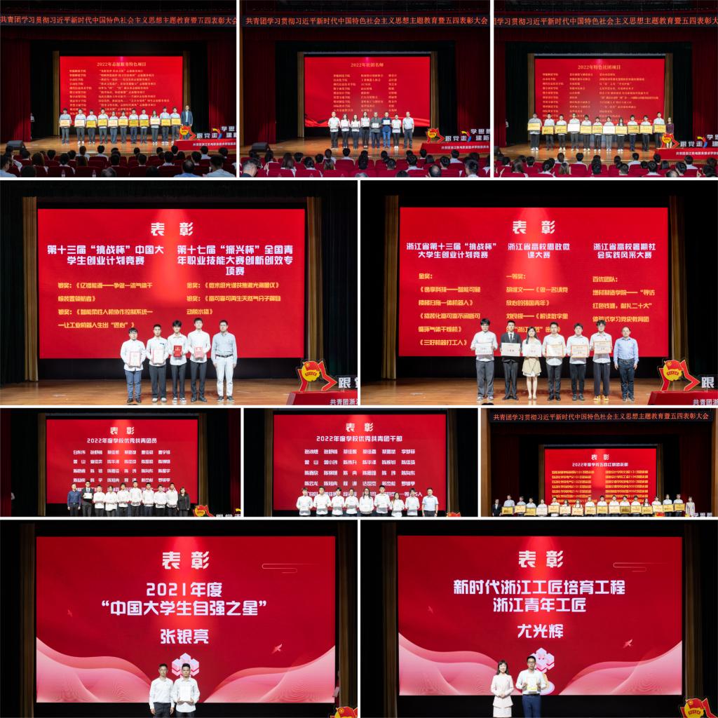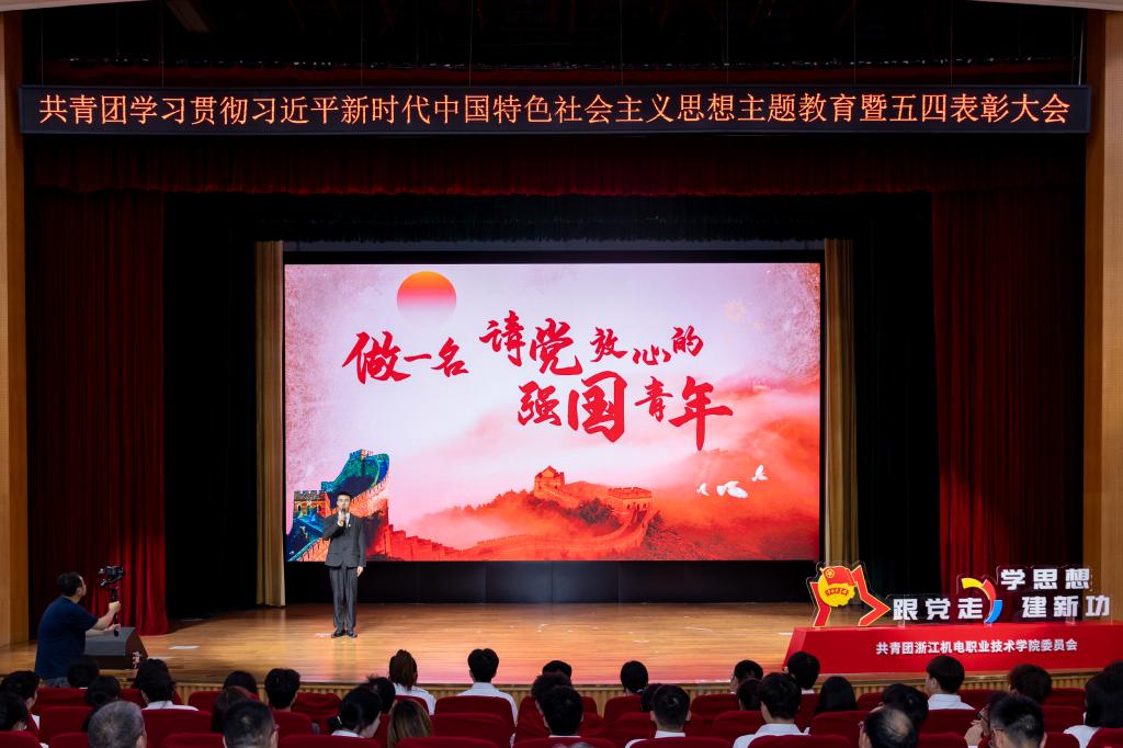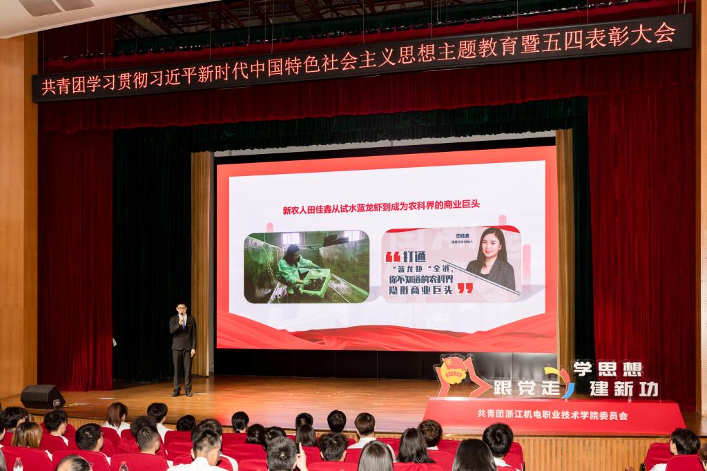 表彰大会在视频《青年 使命》中拉开序幕。杨晨、胡维文两位同学分别展示了思政微课大赛优秀作品《蓝龙虾的唱响曲,新农人的共富力》《做一名请党放心的强国青年》,展现出机电学子爱党爱国、奋发向上、敢闯敢试的精神风貌。随后,一曲《共青春》主题曲《有我》将现场氛围推至高点。