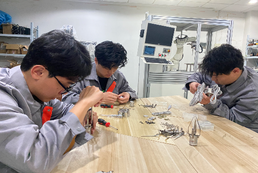 团队成员绘制出初步的产品设计图并建模,在产品样机制作和测试过程中,不断调试装配。针对穴盘苗健康状况难以用机器视觉算法来判断的问题,团队成员自行设计脚本,进行视觉识别实验,得到了准确的视觉算法。针对移栽过程抓手易脱落等难题,团队成员不断寻找资料改进苗爪设计,从一代爪创新研发了二代爪——四爪式仿生起苗装置,实现快速稳定的抓取效果。最终,制作出一款采用具有机器视觉检测、四爪式仿生起苗器、三轴精确立体定位等多项先进技术的成型样机,不断提高产品的稳定性和准确率。