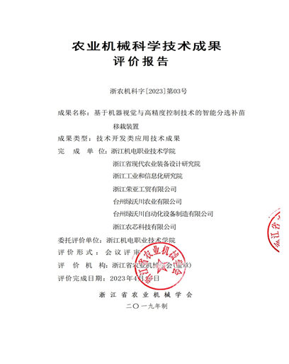 目前,该装置已获得农机产品鉴定报告、科技查新报告等,并在浙江省余姚市英苗农机服务专业合作社、浙江省余姚市勤为径农场等进行试用,得到了试用公司的一致好评,为公司带来了实际的效益和收益。