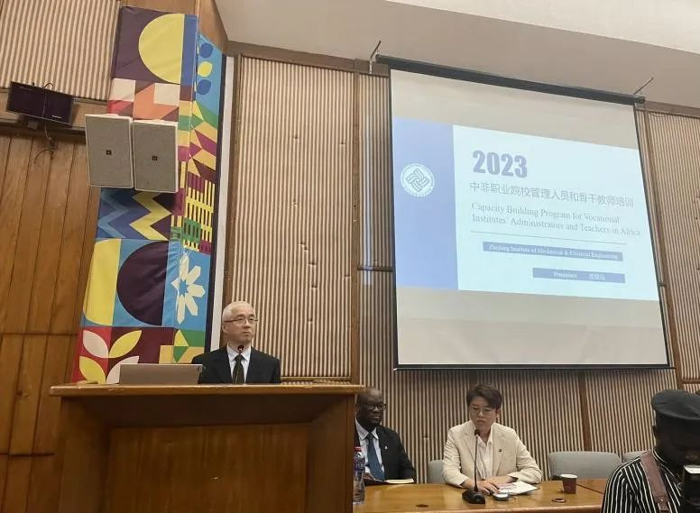 贺星岳向中非两国代表介绍了学校在2022年、2023年举办的两届中非职业院校管理人员和骨干教师培训的背景、实施方案以及取得的社会效益,分享了学校职业技术教育与培训方面的良好实践。
