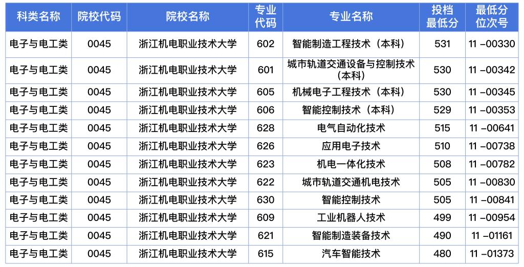 在全省本科的电子与电工类招生中,我校的城市轨道交通设备与控制技术、智能制造工程技术、机械电子工程技术和智能控制技术等专业的最低投档分位居职教本科第一;在全省专科的电子与电工类招生中,我校机电一体化技术、城市轨道交通机电技术、智能制造装备技术、汽车智能技术、应用电子技术、智能控制技术等专业最低投档分位居全省该专业第一名!