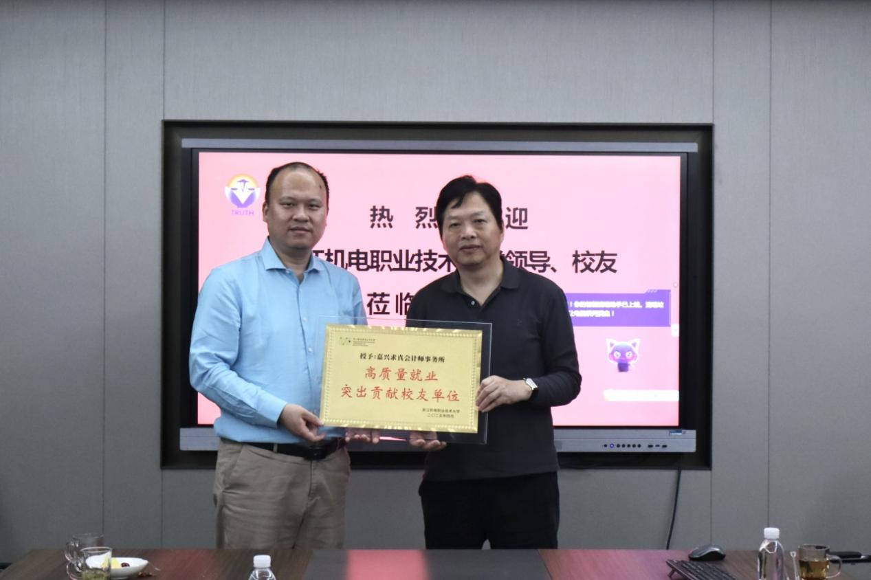 座谈会现场举行浙江机电职业技术大学高质量就业突出贡献校友单位授牌仪式,戴光麟副校长向嘉兴求真会计师事务所所长黄少明授牌。