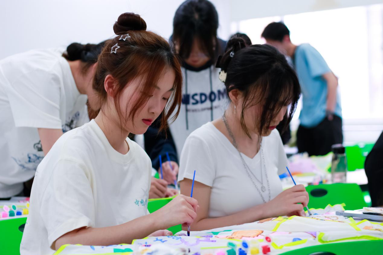 在风筝绘制的过程中,同学们两人一组,发挥创意,用颜料和画笔在空白风筝上绘制属于自己的独特作品,现场气氛轻松愉快。