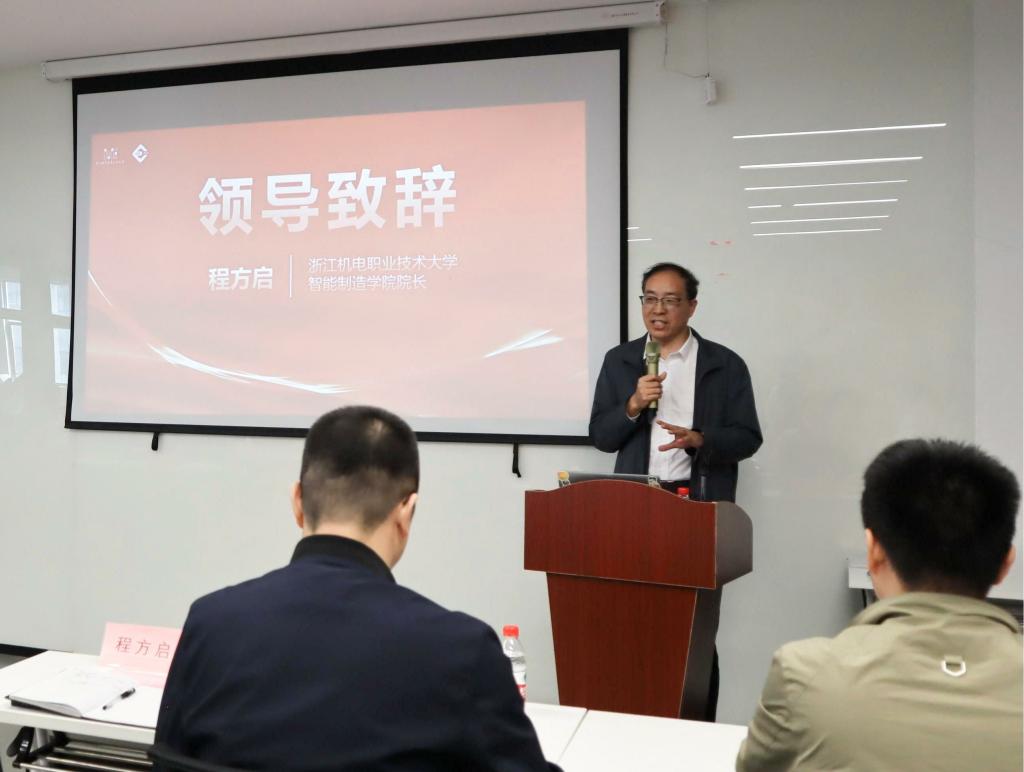 浙江机电职业技术大学智能制造学院院长程方启致辞,他指出“浙江机电—北京华航唯实现场工程师”联合培养项目是教育部批准的国家第一批职业教育现场工程师专项培养计划立项项目,是校企双方落实新职业教育法、实践中国特色学徒制的具体举措和全新探索。浙江机电职业技术大学与华航唯实校企双方的合作可以实现优势互补,强强联合,共同培养建设精操作、懂工艺、善协作、能创新的高素质技术技能人才,助推产业迭代升级。他勉励学员们要珍惜把握此次入企学习实践机会,遵守企业规章,锤炼专业技能,具有实干精神,发扬团队合作精神,展现机电学子风采。与华航唯实携手推进教育部现场工程师人才培养项目工作,打造成为机械行业职业教育现场工程师人才培养项目的示范标杆项目。