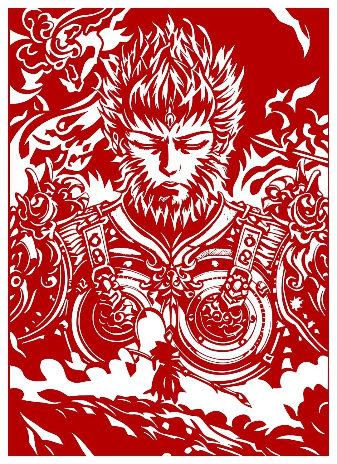 作品介绍:以孙悟空为创作对象。创作思路上,首先提取孙悟空标志性的猴脸、火眼金睛和冲天毛发元素,凸显其独特形象。用传统剪纸的阴刻、阳刻手法,展现战甲的精致纹路,体现工艺之美。背景融入祥云、火焰纹样,增添神话氛围,以红色为主色调,既符合剪纸传统色彩,又传达出孙悟空的热烈、勇敢,彰显其反抗与战斗精神。