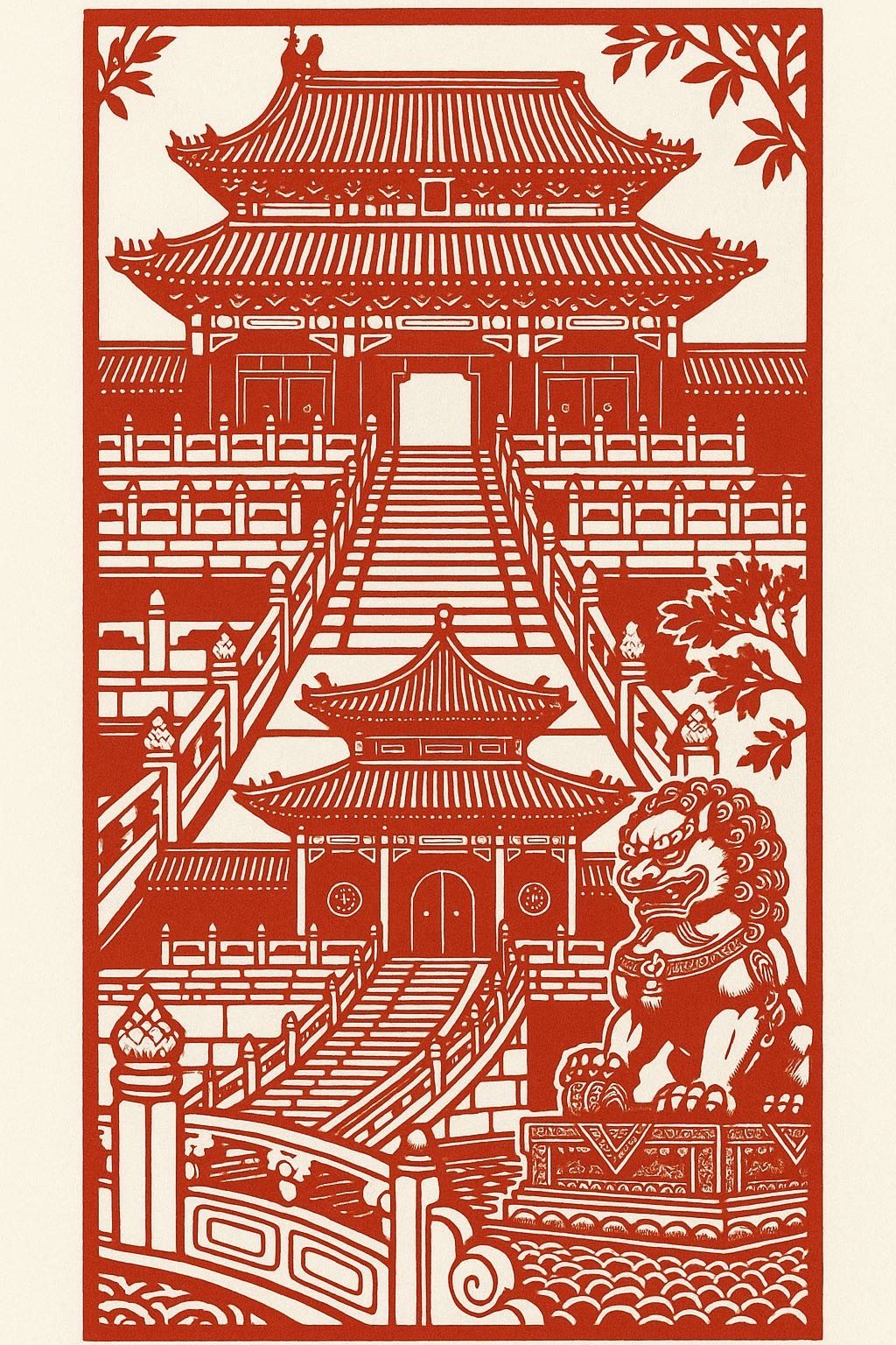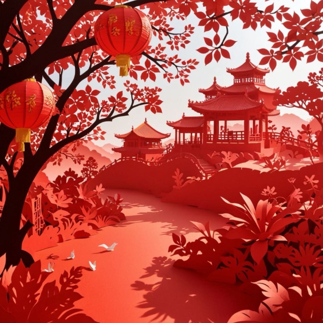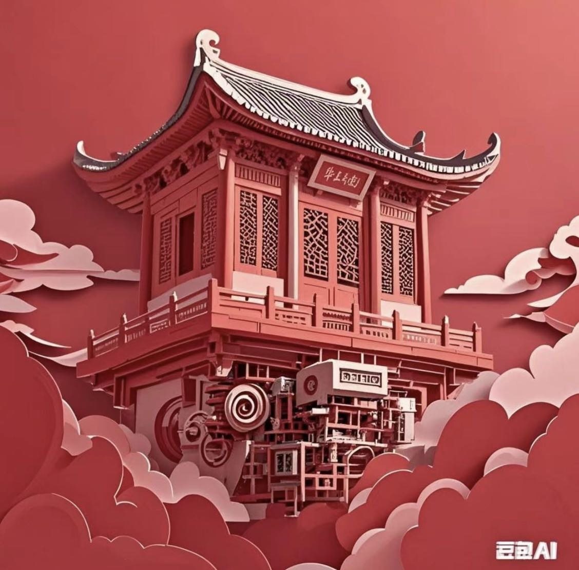 作品介绍:创作灵感来自中国传统剪纸艺术,借AI突破工艺限制,精心雕琢细节,构建丰富画面。选用红色搭配古建、灯笼等元素,寓意传承与敬意。古建述历史,灯笼寓团圆。此作融合传统与科技,展现传统魅力,彰显科技赋能文化创新之力。