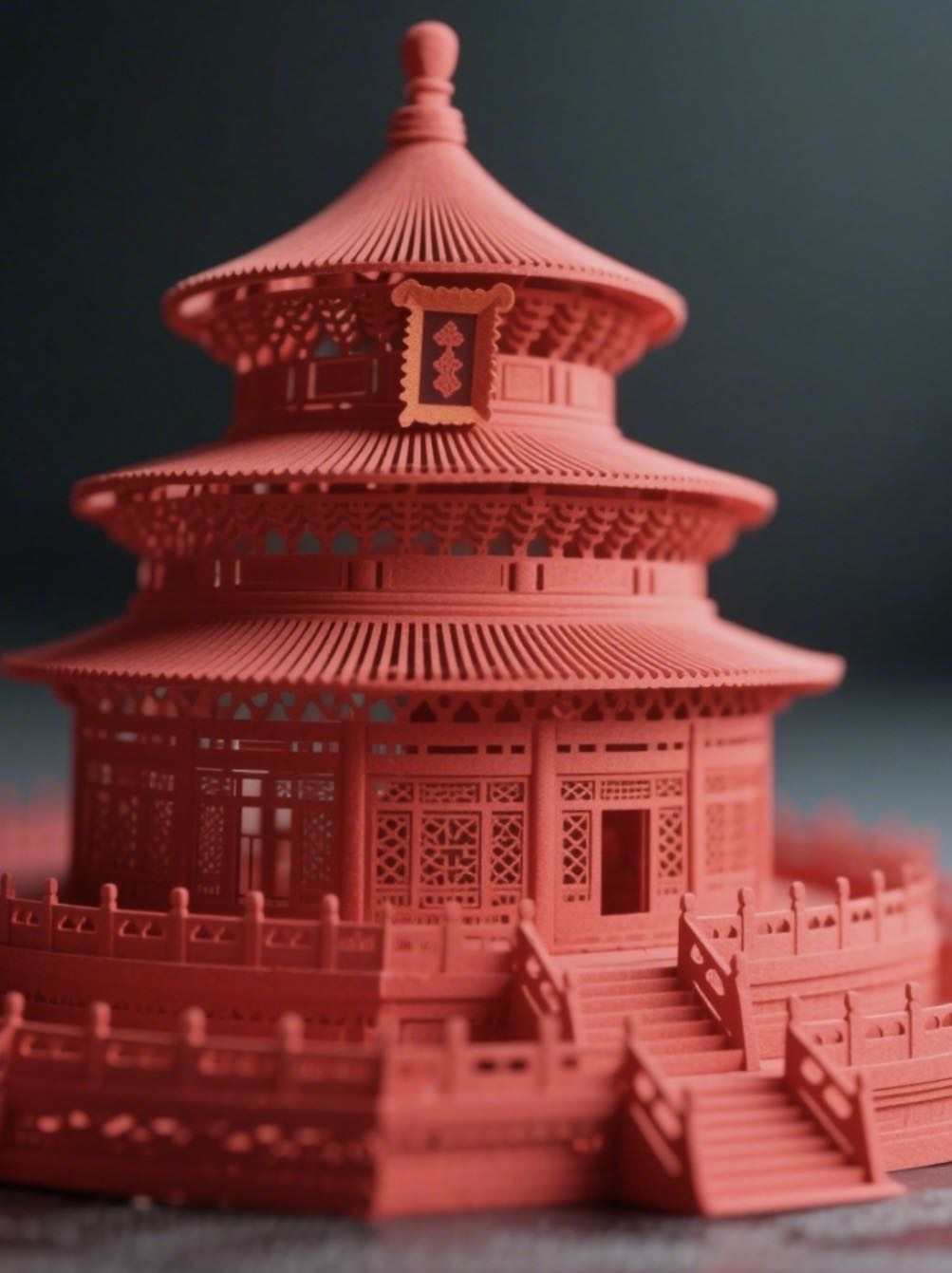 作品介绍:其灵感源于中国古代建筑瑰宝天坛,其承载着深厚文化底蕴。先精准测量天坛比例,确保模型结构准确。采用镂空雕刻技法,复刻祈年殿精巧门窗与斗拱,展现传统木构建筑神韵。分层塑造各部分,从围栏到攒尖顶,逐步堆叠,最后统一上色,以朱砂红呈现古朴庄重之感,让天坛神韵在微缩模型中再现。