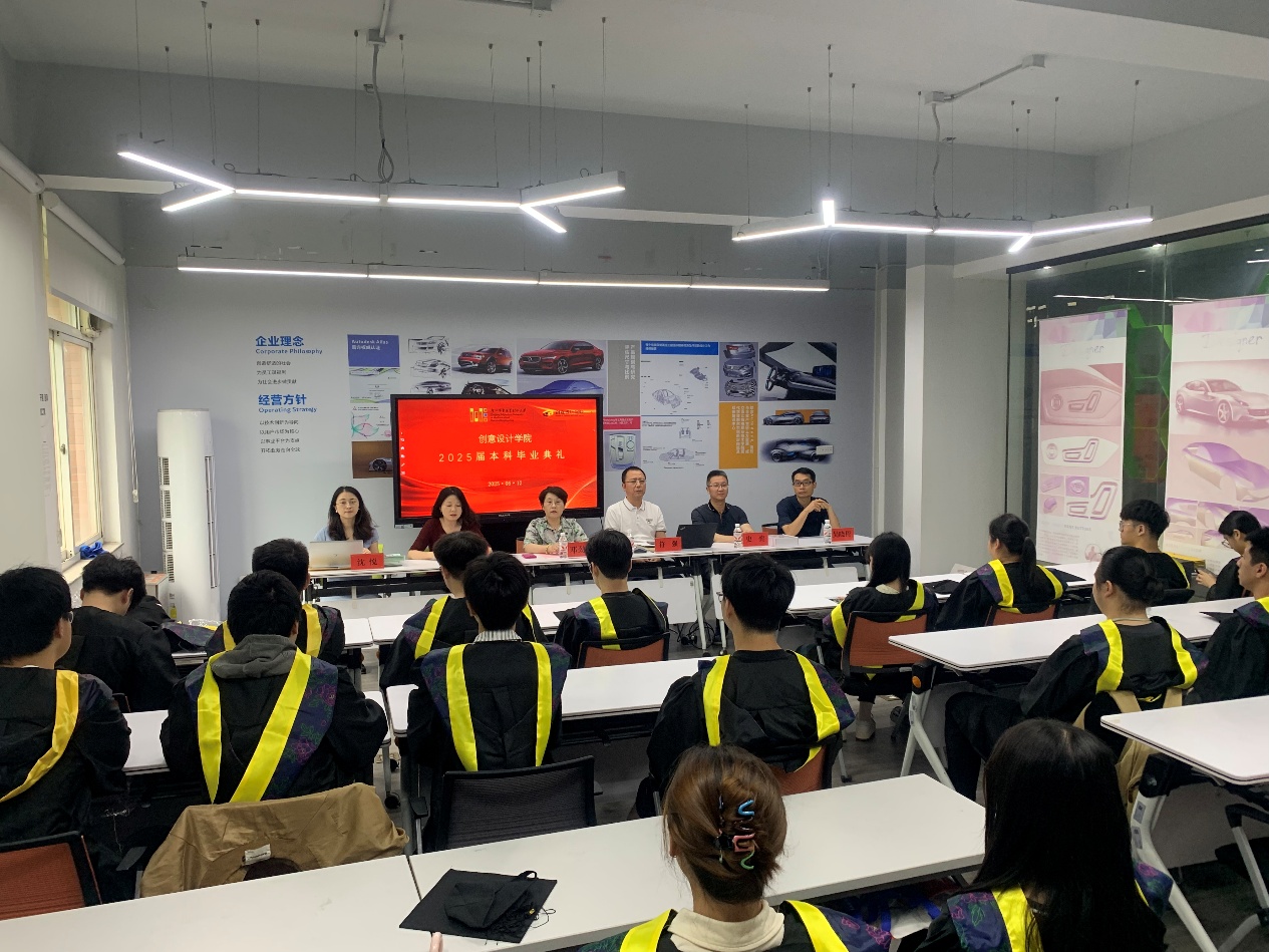 2025年6月12日,创意设计学院举行了2025届工业设计本科毕业典礼暨学位颁发仪式。出席此次会议有创意设计学院院长邓劲莲、党总支书记符强、副书记史奕、工业设计专业教师与全体本科毕业生,毕业典礼由副院长季海祺主持。师生齐聚一堂,共同见证这一重要时刻,通过寄语、颁发证书、拨穗等环节,为毕业生的大学生活画上圆满句号,也为他们的未来征程送上深切祝福。
