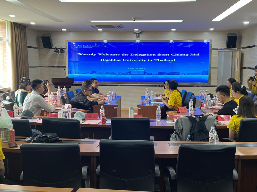 两校在滨江校区举行座谈会。学校国际教育学院院长陶宇,副院长张伟中,国际交流合作处与国际教育学院相关人员参加会议。陶院长表示此次交流是落实“一带一路”教育行动的具体举措,未来双方将在师资培训、学生交流等领域深化合作。清迈皇家大学国际教育学院院长CHUENCHOM强调,职业教育需紧跟产业变革步伐,期待两校共同探索AI赋能人才培养的新模式。