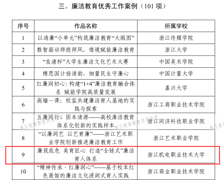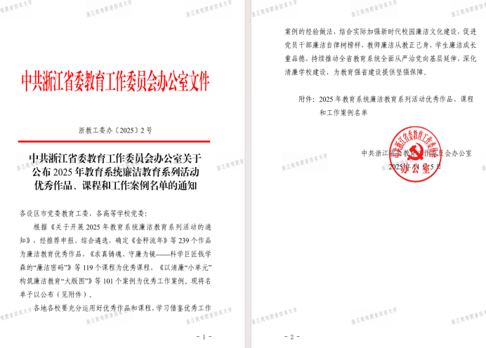 近日,中共浙江省委教育工作委员会办公室公布了2025年教育系统廉洁教育系列活动优秀作品、课程和工作案例名单。我校报送的多项作品荣膺佳绩,获得特等奖1项、二等奖1项及优秀工作案例1项。其中,创意设计学院《青莲酷玩APP》获特等奖并被推荐至教育部参评第十届高校廉洁教育系列活动,创下学校该赛事历史最好成绩。此外,创意设计学院选送的《历代家诫家训五则》获创意类二等奖、工作案例《廉筑底色美育匠心,打造“全链式”廉洁育人体系》获评优秀工作案例。