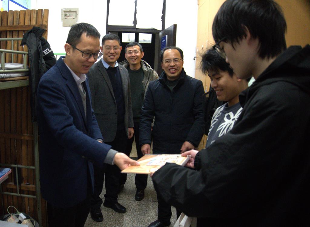 陈剑波还特别慰问了经济困难学生,亲手送上爱心礼包,鼓励他们保持积极心态,克服暂时困难,学校始终是他们的坚强后盾。随后,他走访了学生干部代表寝室,对学生干部的辛勤付出表示肯定,并希望大家在节日期间也能积极关注身边同学,传递温暖。