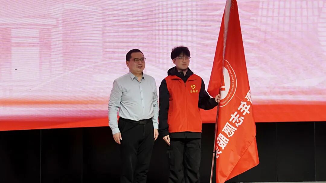 荣誉授予环节,到场嘉宾为各学院无偿献血宣传大使逐一颁发聘书。每一份聘书既是对参与者公益初心的认可与荣誉,更是一份传递爱心、践行公益的责任担当。随后,严俨向学校青年无偿献血志愿服务队授旗,鲜红的旗帜在台上飘扬,象征着青年公益力量的正式集结与爱心传承。