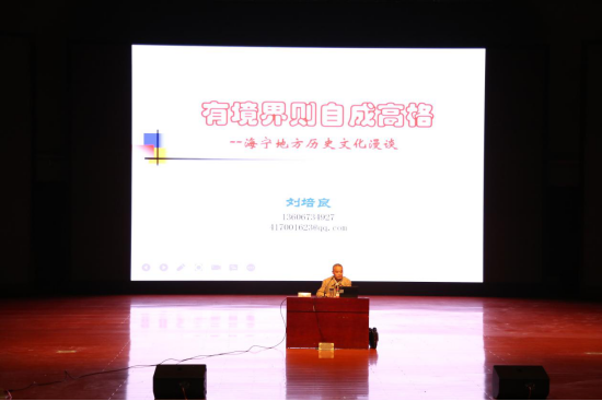 为了让广大同学更好的了解海宁,4月11日晚,海宁市政协教育界委员走进海宁校区开展了“海宁地方历史文化漫谈”专题讲座,海宁市政协常委、王国维研究会会长刘培良主讲,海宁市政协常委、海宁市第一中学校长邬明杰,海宁市政协委员、市特殊学校校长査姚卫,海宁市政协委员浦利堂,海宁市政协委员、学院计算机基础教研室主任周子立以及海宁校区各班级400余名学生参加了讲座,讲座由学工部副部长方惠玲主持。