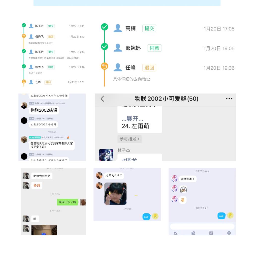为保障学生安全离校返家,学院采用班干部、班主任、辅导员、学院总支书记逐级负责的方式收集学生寒假去向表,联结学生、家长,做到学生去向能掌握,学生返家有反馈。紧抓学生离校易班审批制度,对于出行时间、出行方式、出行地点模糊的申请,坚决退回修改,保证离校申请详实可查安全性;通过返家后报告班主任、班级群接龙的形式掌握学生去向。