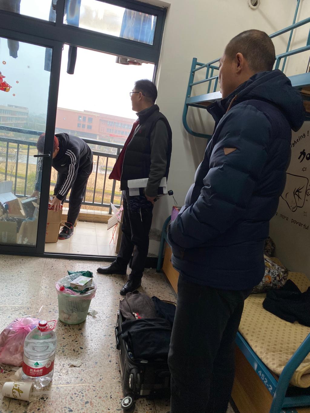 1月23日,学院共有332名大一同学离校返家,党总支书记任峰深入学生寝室看望学生,向同学们了解离校返家情况。在交流中,任书记叮嘱同学们,乘坐公共交通工具出行的同学一定做好防护,戴口罩、勤洗手、使用消毒湿巾;最后一个离开寝室的同学要断电,收好阳台衣物,带走垃圾,锁好门窗……同学们一边收拾行李,一边与前来看望他们的领导老师亲切交谈。对于23日以后返家的同学,任峰书记询问了大家的吃饭、出行是否存在问题,对学生的疑问一一解答。
