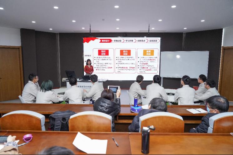 董珊珊老师以《德技并修、知行合一》为题对《思想道德修养与法律基础》课程进行了说课展示。董老师从教学整体设计、教学实施过程、学习效果、教学创新亮点以及教学反思改进向现场的专家领导一一展示,重点突出疫情防控期间我校线上思政课教学新举措,详细介绍了思政课信息化教学手段、互动化教学环节、体验化教学实践等“三化教学”的创新设计和特色模式。