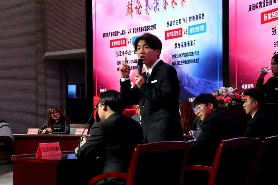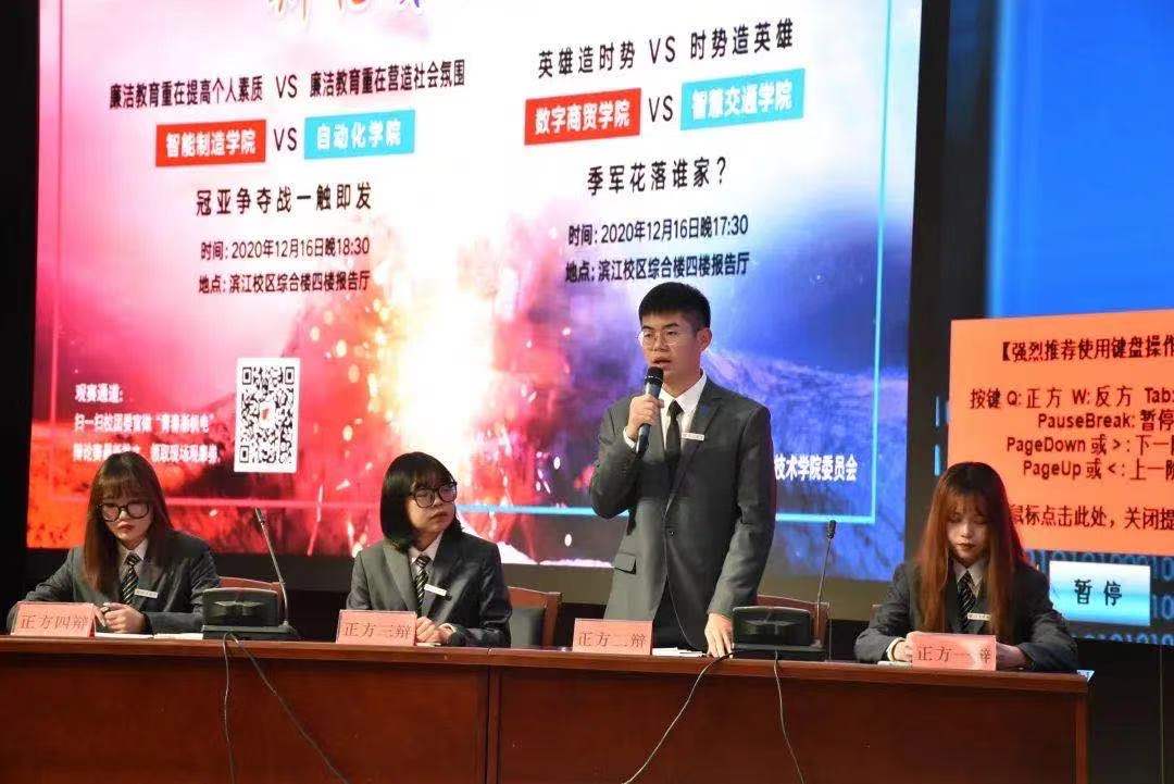 “廉洁青春 阳光同行”——我院第二十七届“舵手杯”辩论赛于12月16日晚在滨江校区综合楼四楼学术报告厅落下帷幕。学校党委委员、纪委书记王斌出席了本次活动,相关部门负责人、二级学院学生工作书记、辅导员及学生150余人参加了活动。