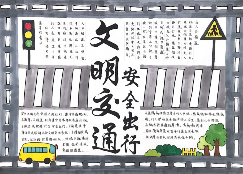 为切实做好大学生交通安全宣传教育工作,不断提高广大师生的交通法制意识、安全意识和公德意识,努力打造平安、和谐的校园交通环境,12月2日~12月14日,智慧交通学院以“文明交通,谦虚礼让”为主题开展交通安全日手抄报比赛,为“122”全国交通安全日宣传造势,促进交通安全意识入脑入心。两校区学生比赛积极参与,优秀作品目不暇接,达到了预期效果。