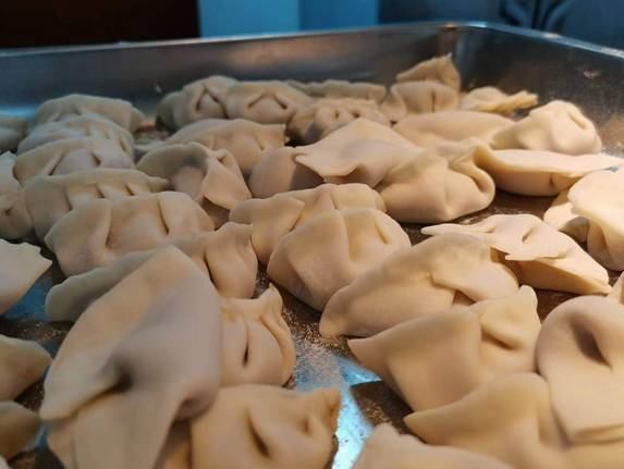 把饺子皮托在手心,加上一筷肉馅放在皮的中间,把饺子皮对折一下,用双手的拇指和食指熟练一捏,一个如元宝一般的饺子迅速呈现在大家面前。点心师傅以东北饺子为特点,向各桌同学传授包饺子快速上手的技巧。各桌的同学分工明确有序,迅速开始动手操作,甚至有创意的同学,自创了各种各样的饺子形状。煮熟的饺子,分发到每一位师生的面前,大家品尝着热乎乎的饺子,在寒冷的冬天享受到了一份家的温暖。