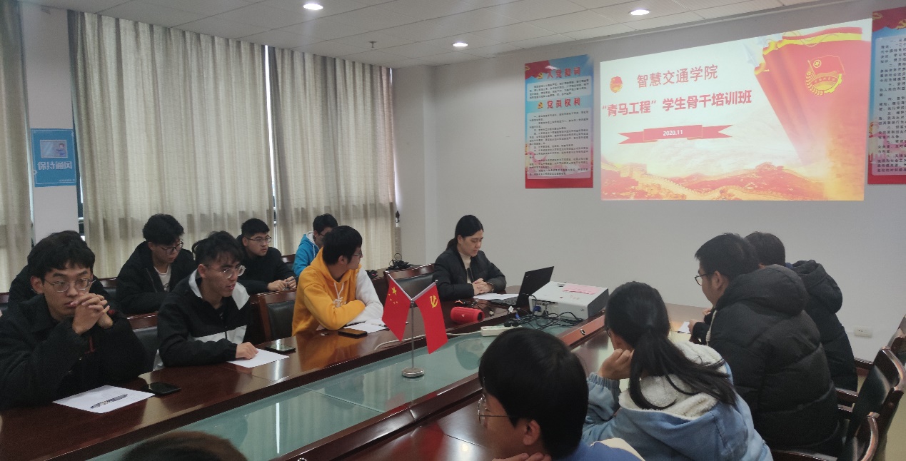 11月28日,智慧交通学院2020年“青马工程”学生骨干培训班开班仪式在综合楼903会议室顺利举行。智慧交通学院党总支书记宋伟文、学工办副主任姚婷、思政辅导员石涛及学生骨干参加了本次开班仪式。