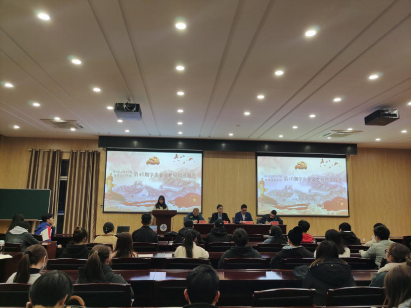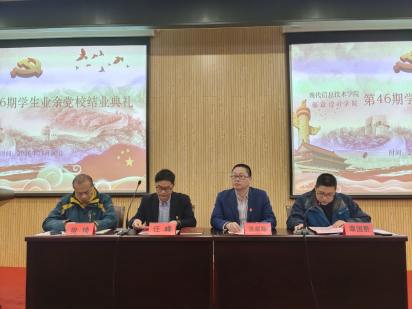11月30日,现代信息技术学院与创意设计学院联合举办的第46期业余党校在5号楼2号厅落下帷幕。现代信息技术学院党总支书记任峰、创意设计学院党总支书记张荣路、现代信息技术学院团总支书记毋琦、创意设计学院团总支书记章国赞出席了本次结业典礼,典礼由章国赞老师主持。