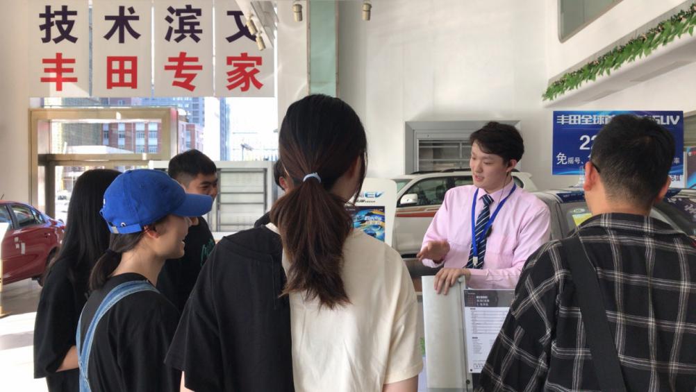 滨文丰田店的工作人员热情的接待了我们。首先,同在滨文丰田店实习的学长袁佳晖给我们介绍了丰田热销的各系车型,如销量王卡罗拉、亚洲龙、普拉多等,学长对各款车型和行情如数家珍,学长的职业素养让学弟学妹着实开了眼界。