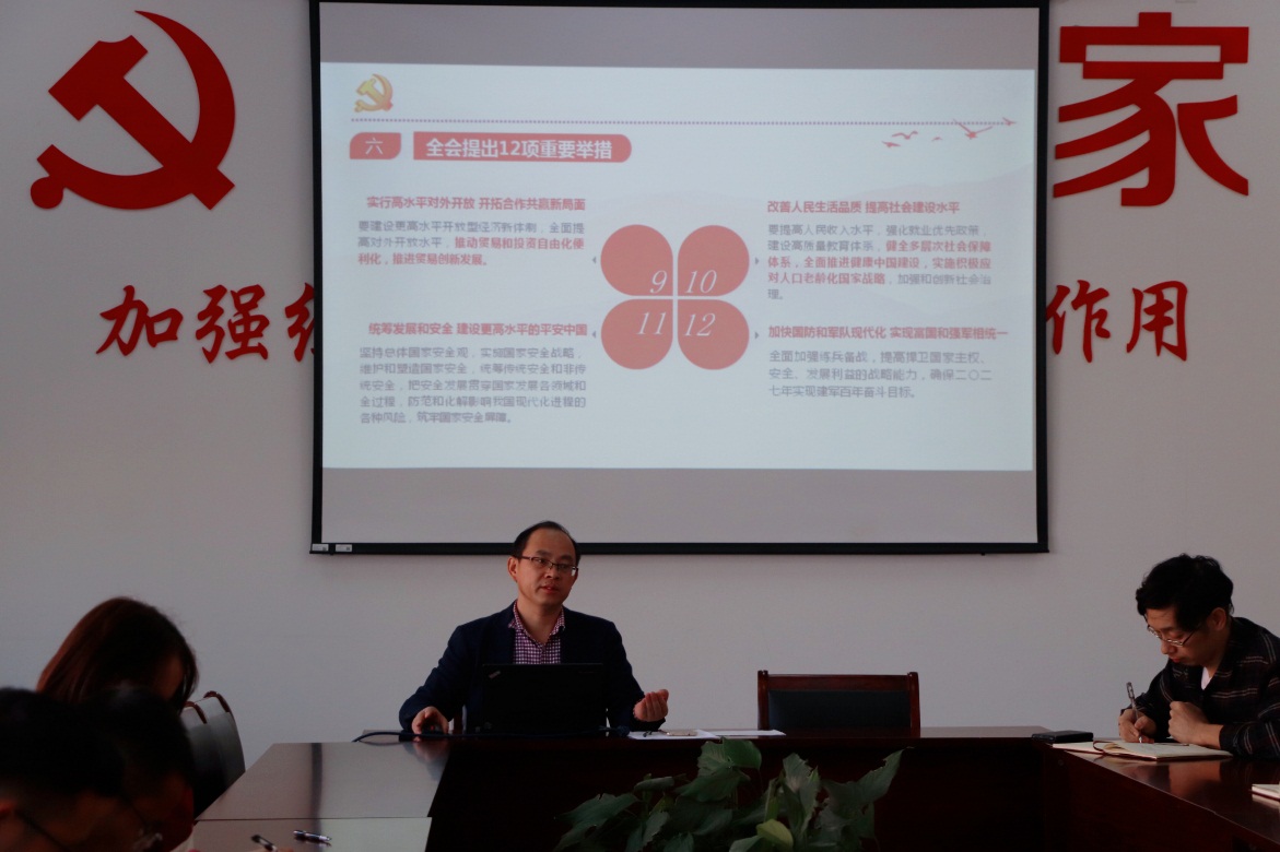 党总支书记陶勇从大会概况、重要成果以及全会公报、《中共中央关于制定国民经济和社会发展第十四个五年规划和二〇三五年远景目标的建议》和习近平总书记对《建议》作的说明等几个方面传达学习了党的十九届五中全会精神。他对“十四五规划”的有关内容进行了重点解读,同时强调,要牢记立德树人根本任务,把五中全会精神有效地结合思政课程、课程思政、理论宣讲、微党课、实践活动等,推动五中全会精神入脑入心;以党建带团建,认真学习把握大会精髓要义,明确历史担当,提高政治站位,把思想和行动统一到全会重大部署上来。